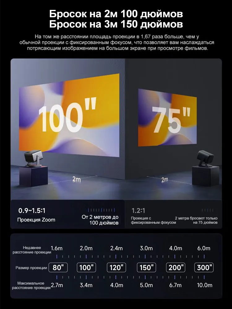 1. Оптический зум. 0,9-1,5 Это значит что при расстоянии от экрана до проектора например в 3м вы получите картинку шириной от 3/1,5=2м до 3/0,9=3,33м шириной без обрезки пикселей и потери качества 4k.