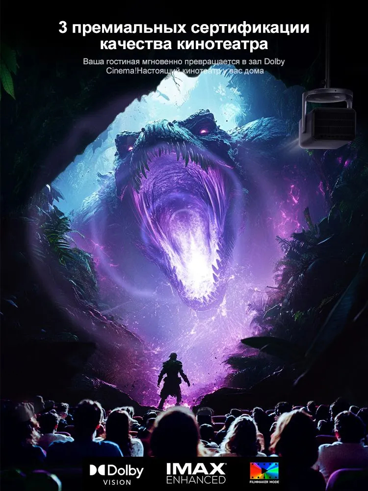2. Яркость 2400 CVIA люмен, 110% покрытия цветового пространства BT 2020. Позволяет с 4-5м получить картинку на всю стену от пола до потолка.